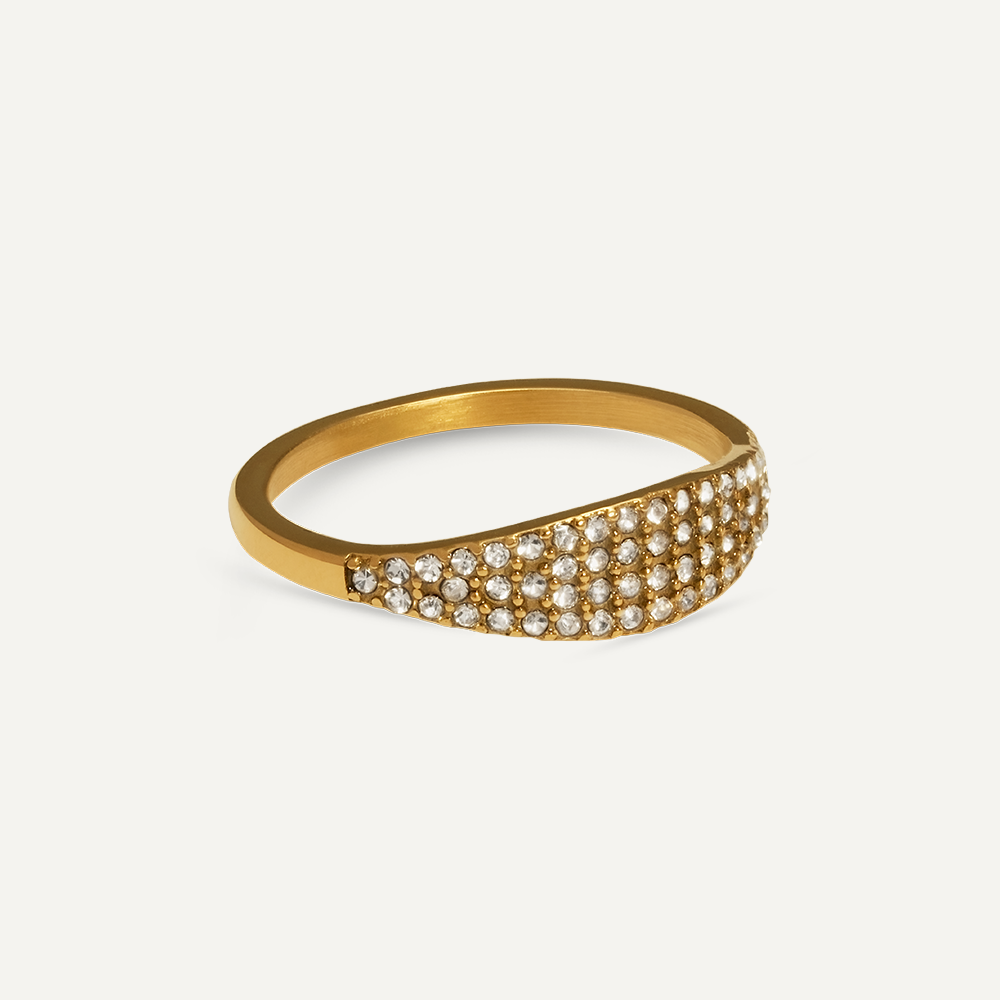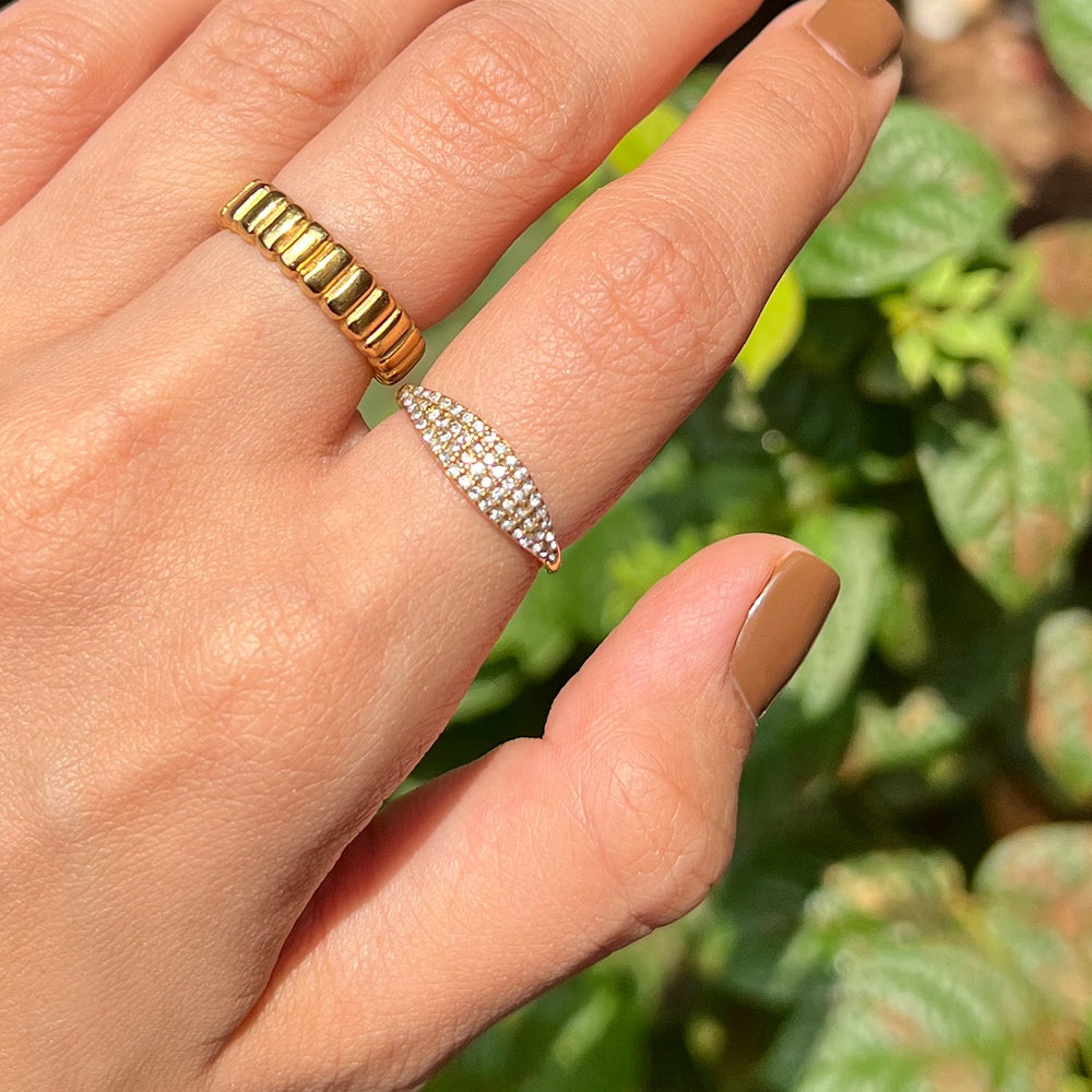 This classy ring featuring CZ stones are set in a 18K Gold Plated Stainless Steel Band, making it elegant for any occasion. Mix and match for a stacked look.