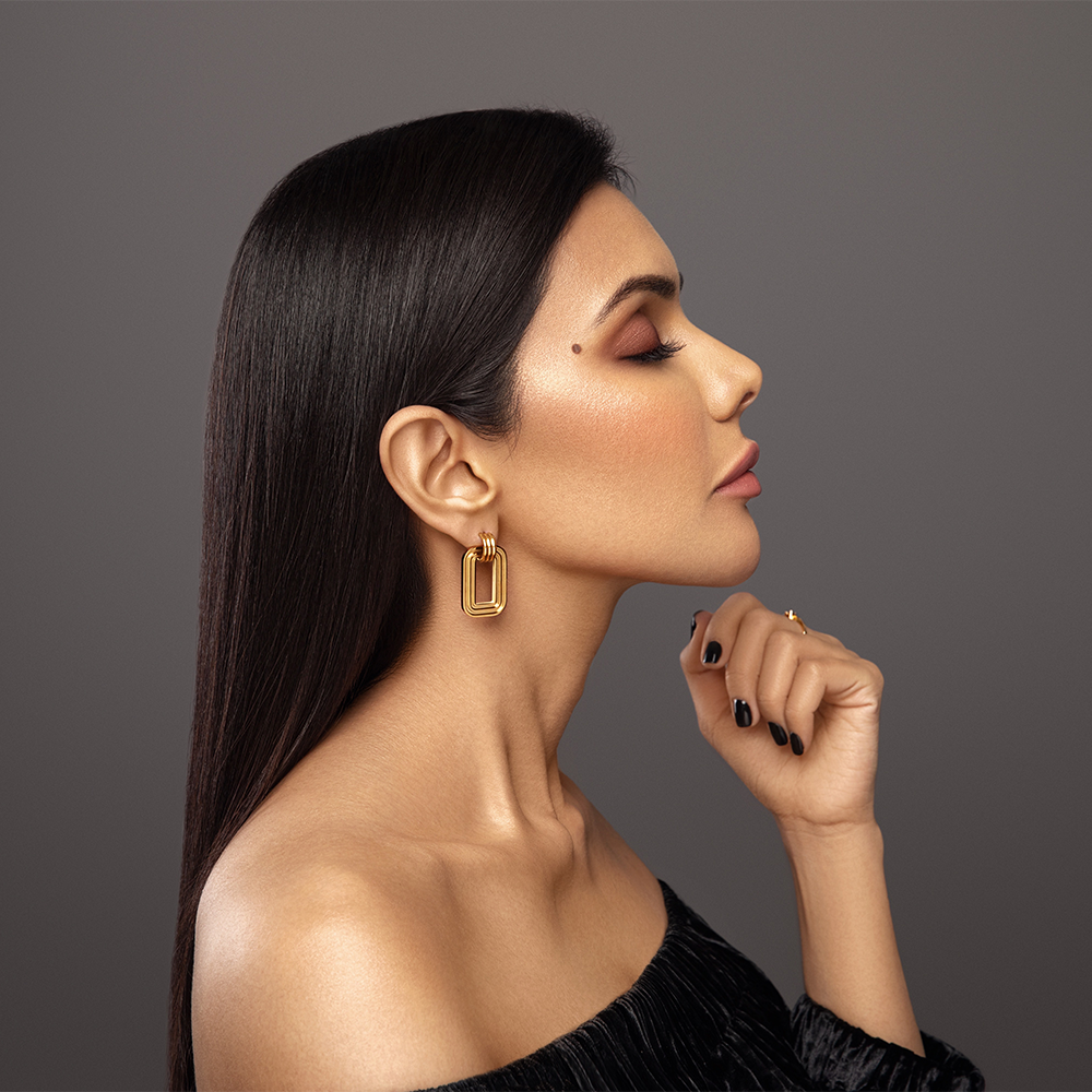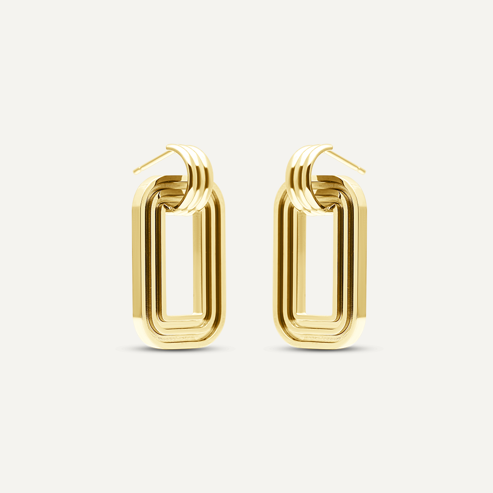 Modern and edgy rectangular hoop earrings with 18k PVD Gold Plating.