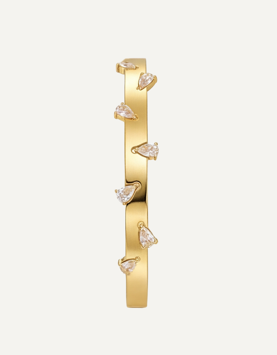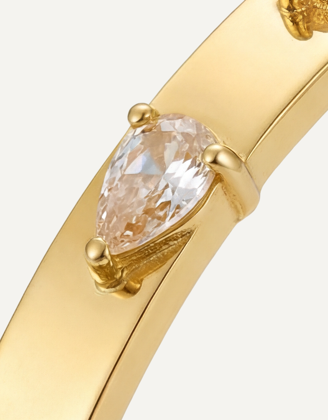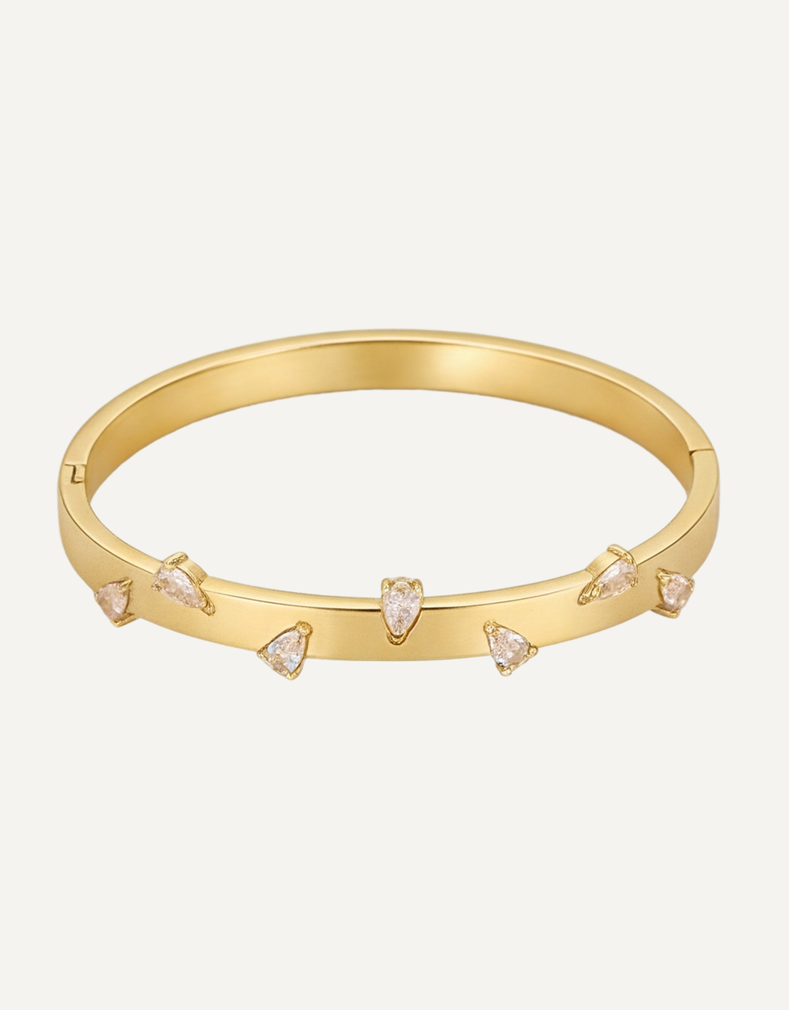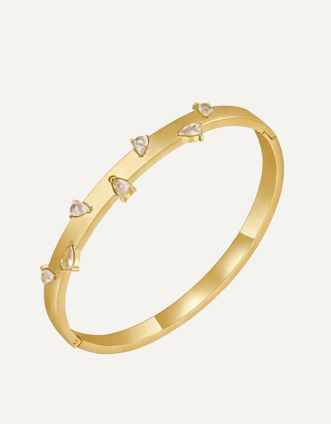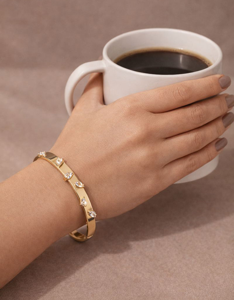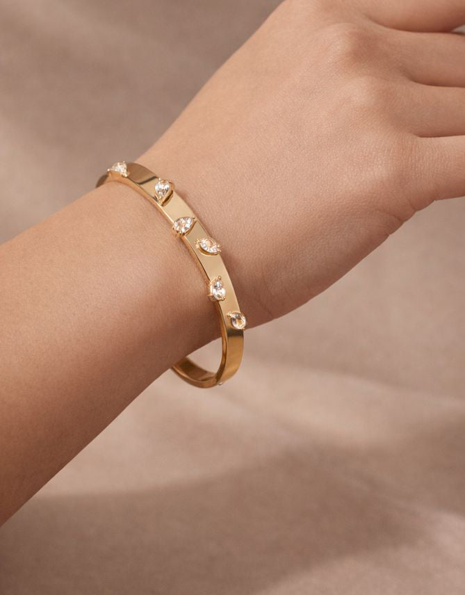The Crystal Dew Bangle brings a touch of delicate sparkle to your everyday style. Set with petite zircon stones that catch the light from every angle, it balances minimal elegance with a refined shimmer, perfect for both effortless day looks and elevated evenings.