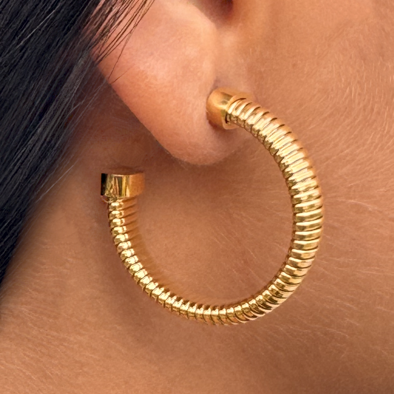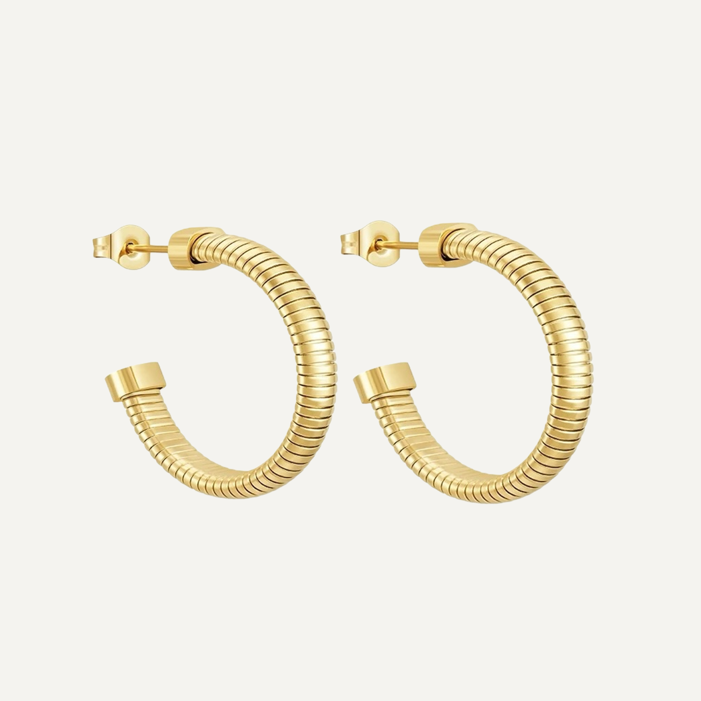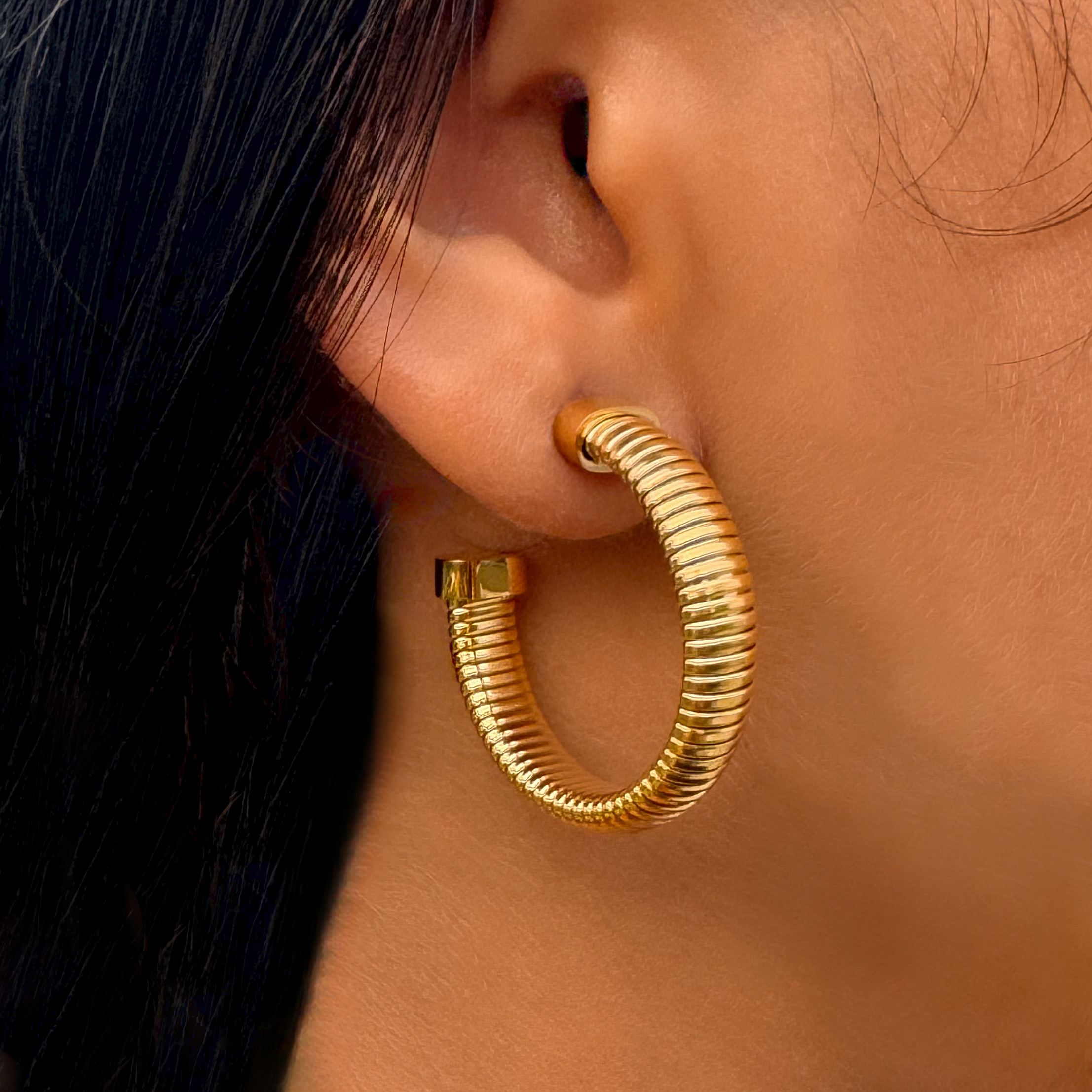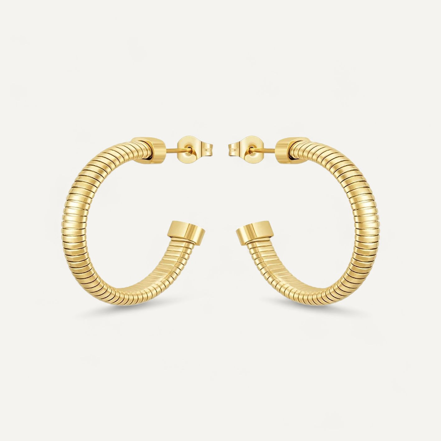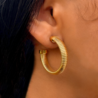 Lightweight and designed to coordinate seamlessly with our Daylight bracelet, choker, and ring, these classic hoops complete your accessory set with a luxurious, rich gold finish
