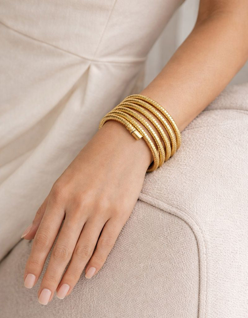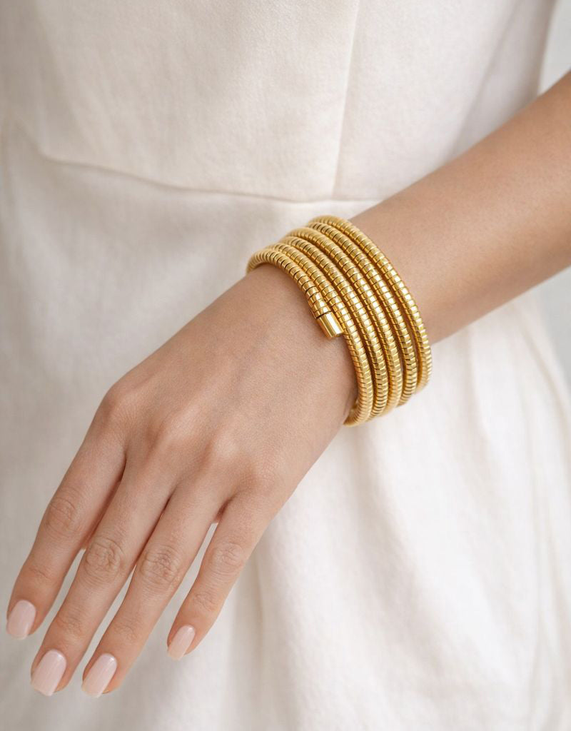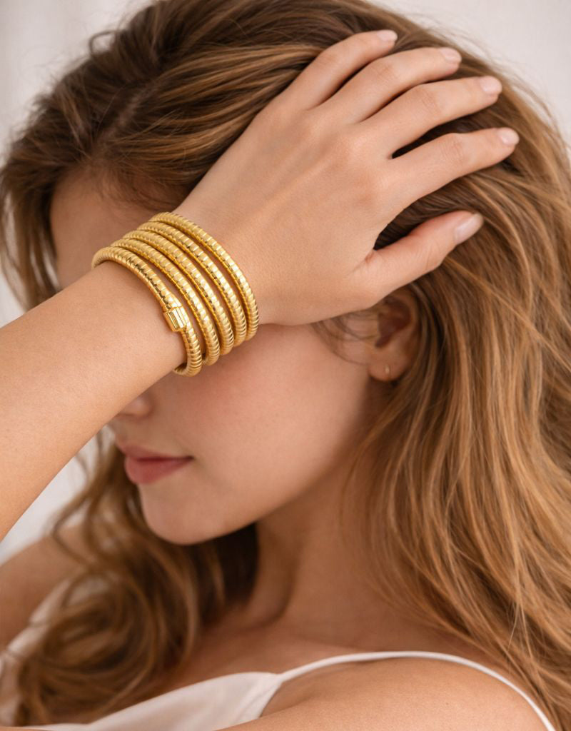 A sculptural statement designed for everyday elegance, the Daylight Coil Bracelet features four seamlessly connected bangles that create the look of a perfectly layered stack, without the effort. Its fluid, coiled silhouette wraps the wrist with a refined, modern edge, making it a standout piece for both day and evening wear.