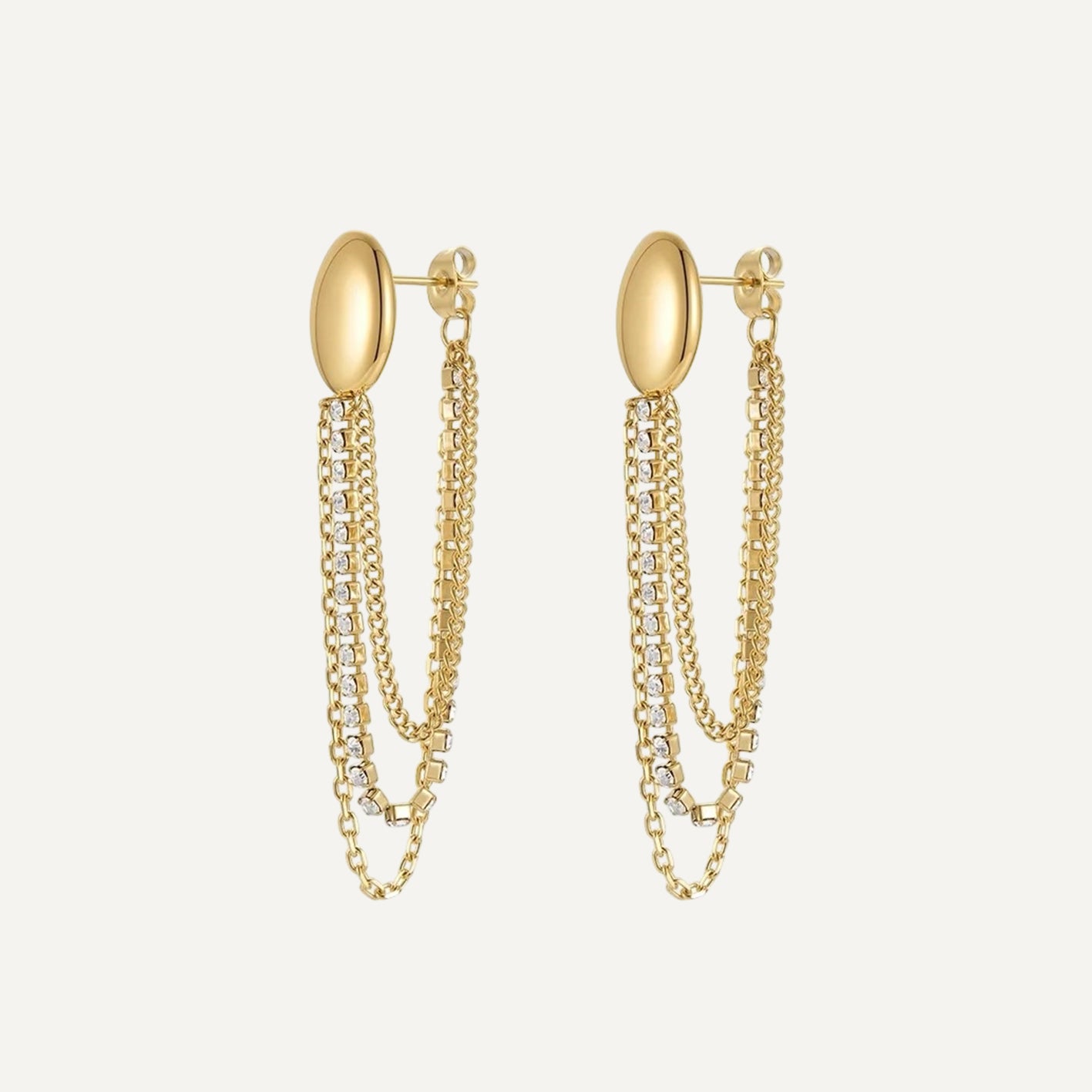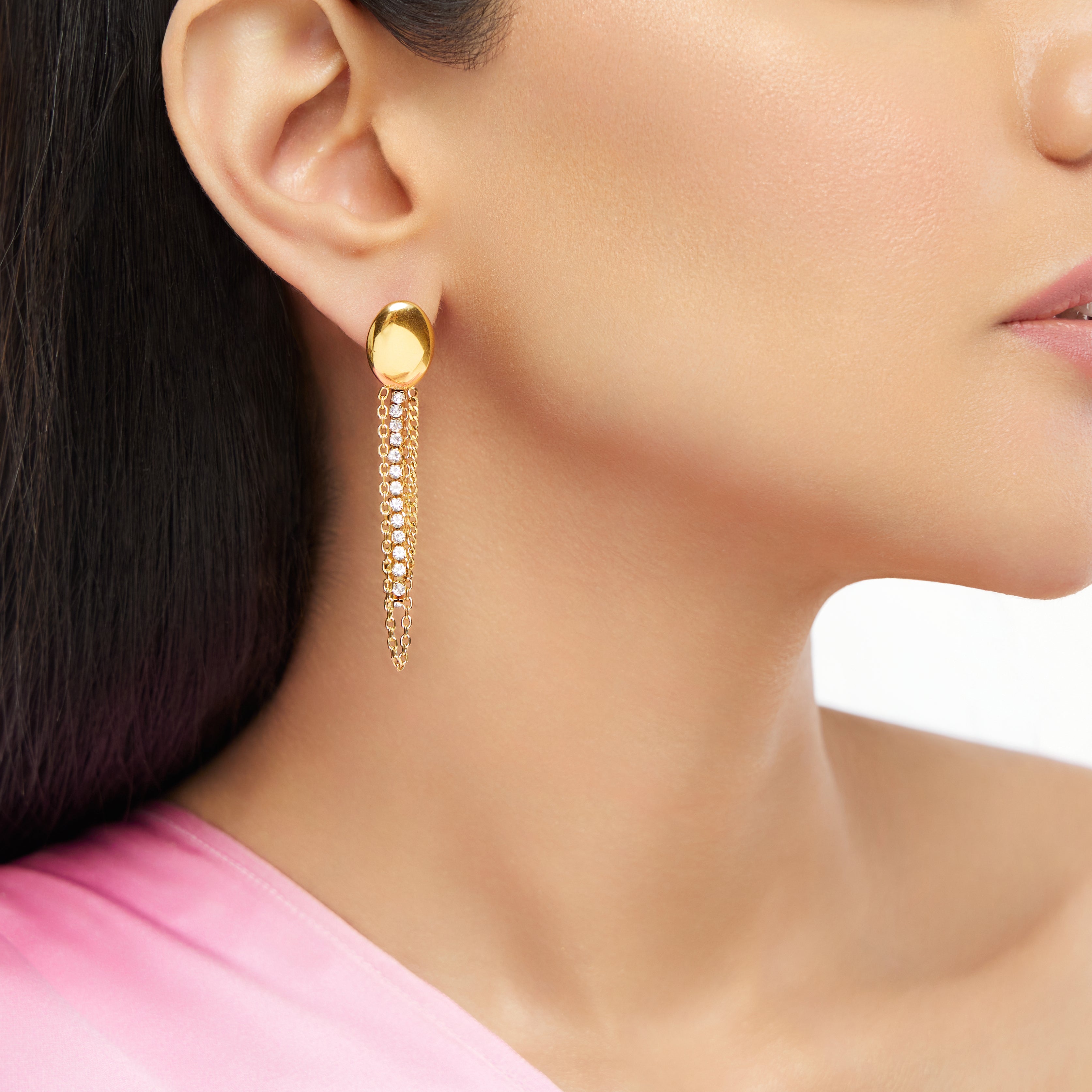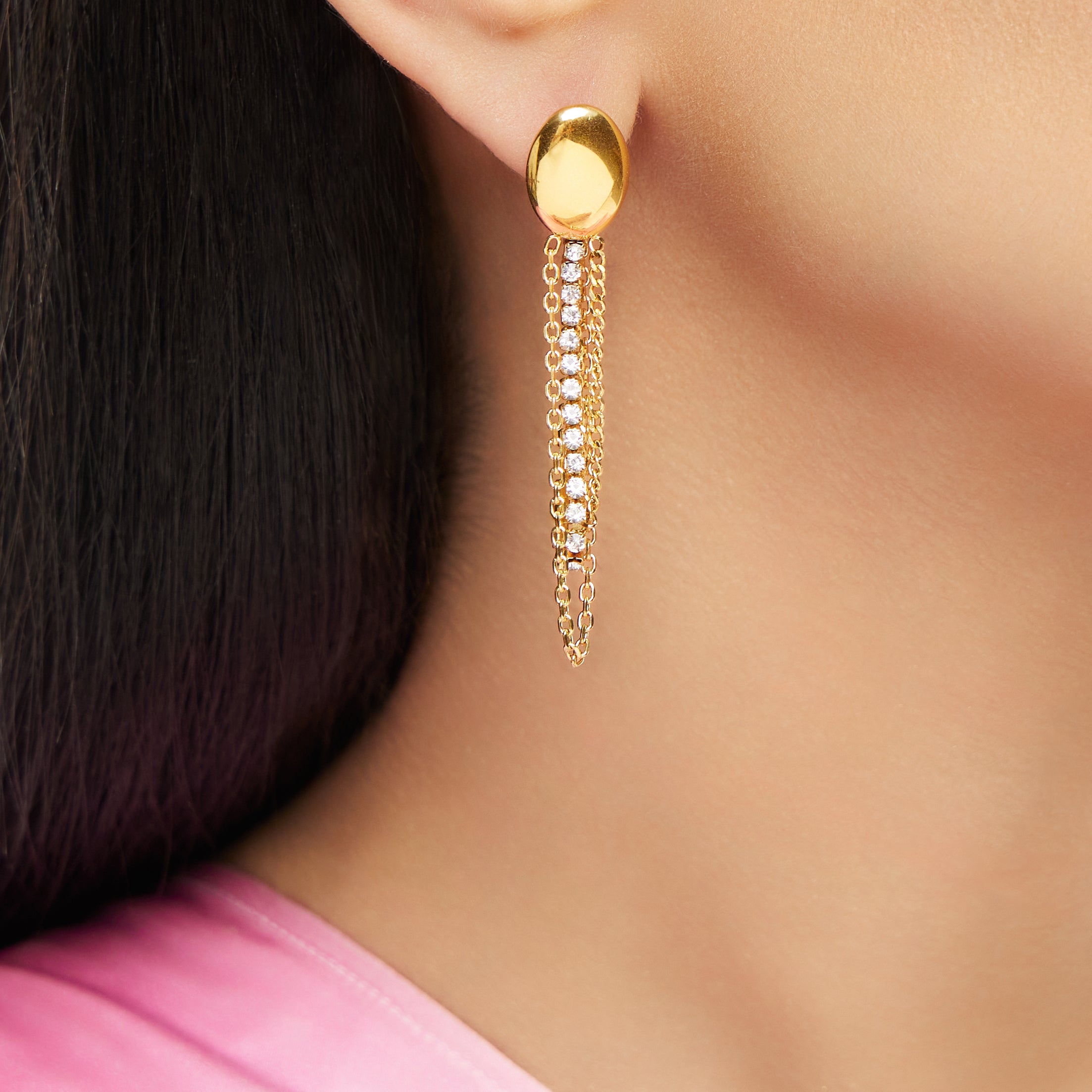 Introducing the Diamond Cascade Earrings, plated in 18k gold and featuring a graceful flow of shimmering diamonds. The cascading design captures light with every movement, while the gold accents add a touch of warmth and elegance. Perfect for special occasions or refined everyday wear, these earrings embody timeless glamour.