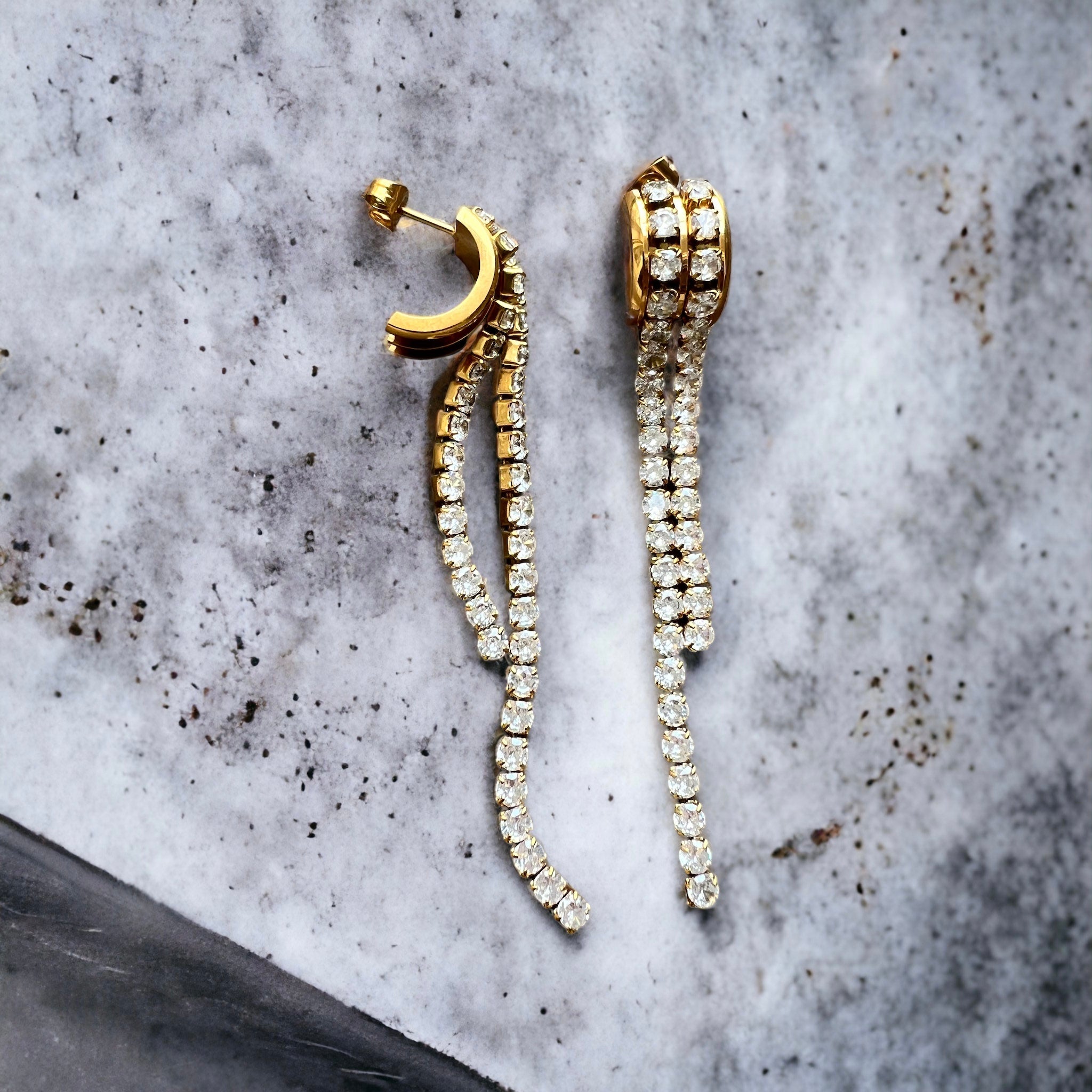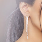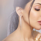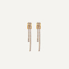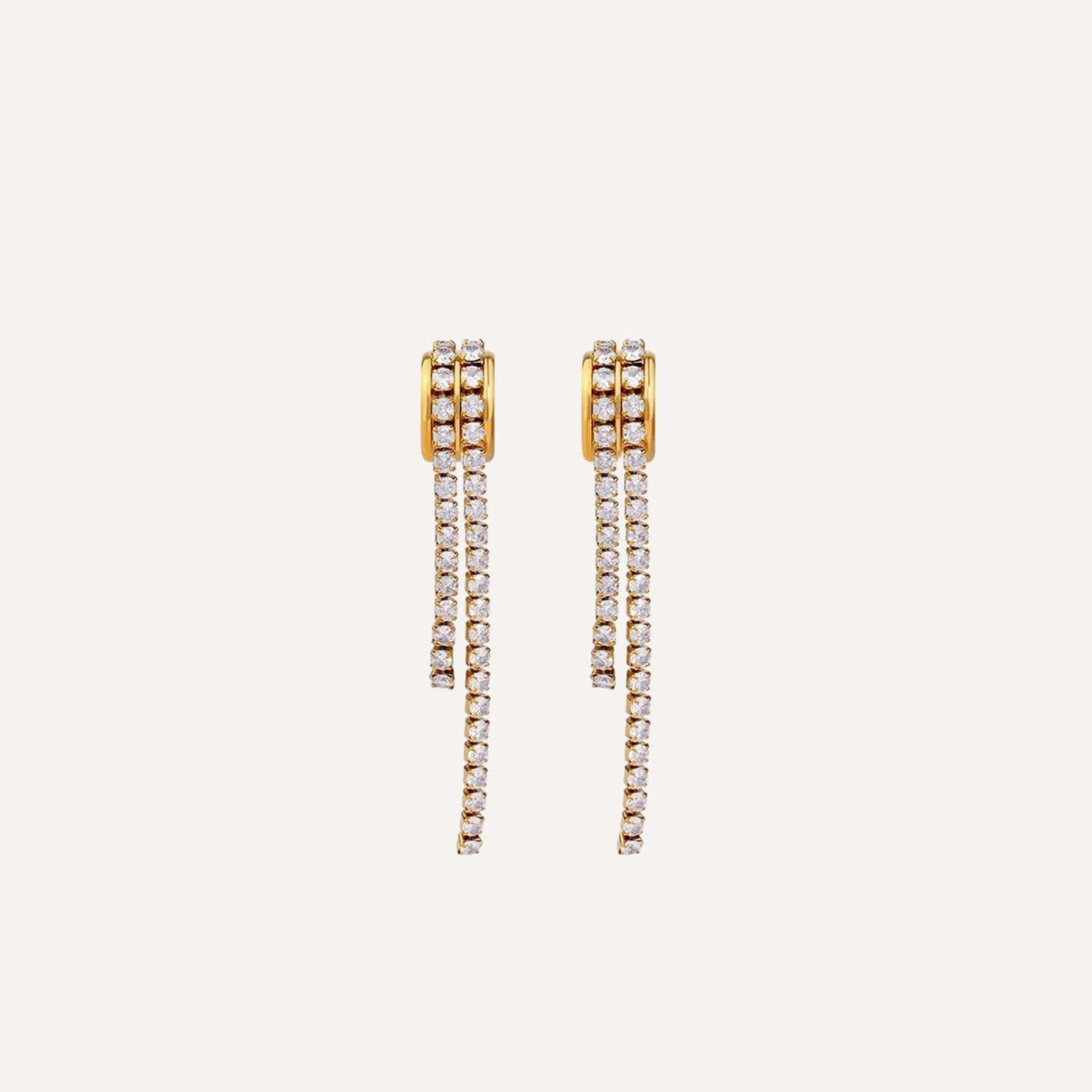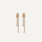 A pair of drop earrings that catches the light in every setting. Featuring 2 rows of CZ crystal drops and 18K Gold Plating, these would look best with an up-do or slicked back hair for a confident look.