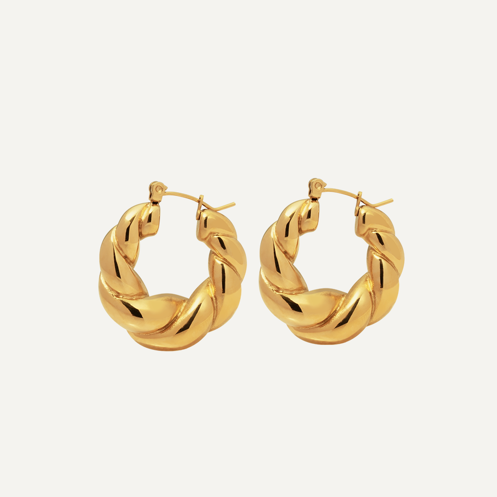 Chunky gold twisted hoops that are definitely a crowd pleaser. Made from Stainless Steel with thick 18k Gold Plating.