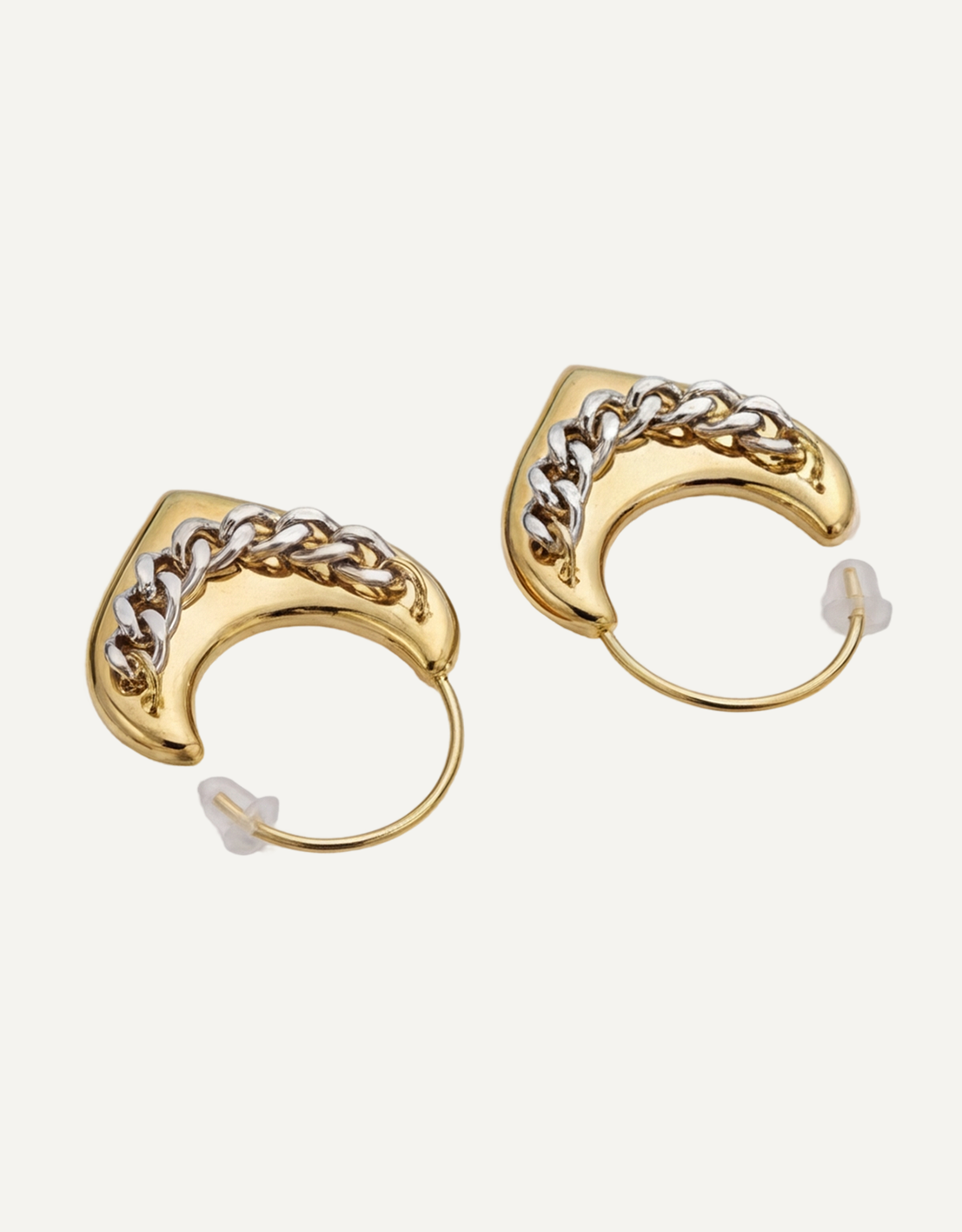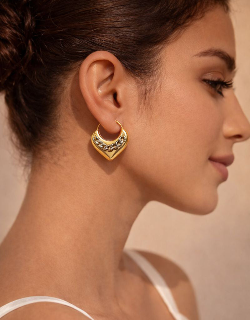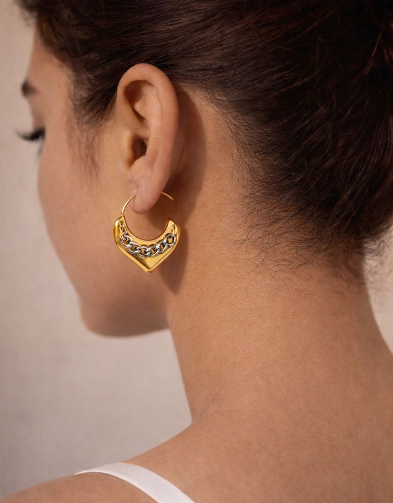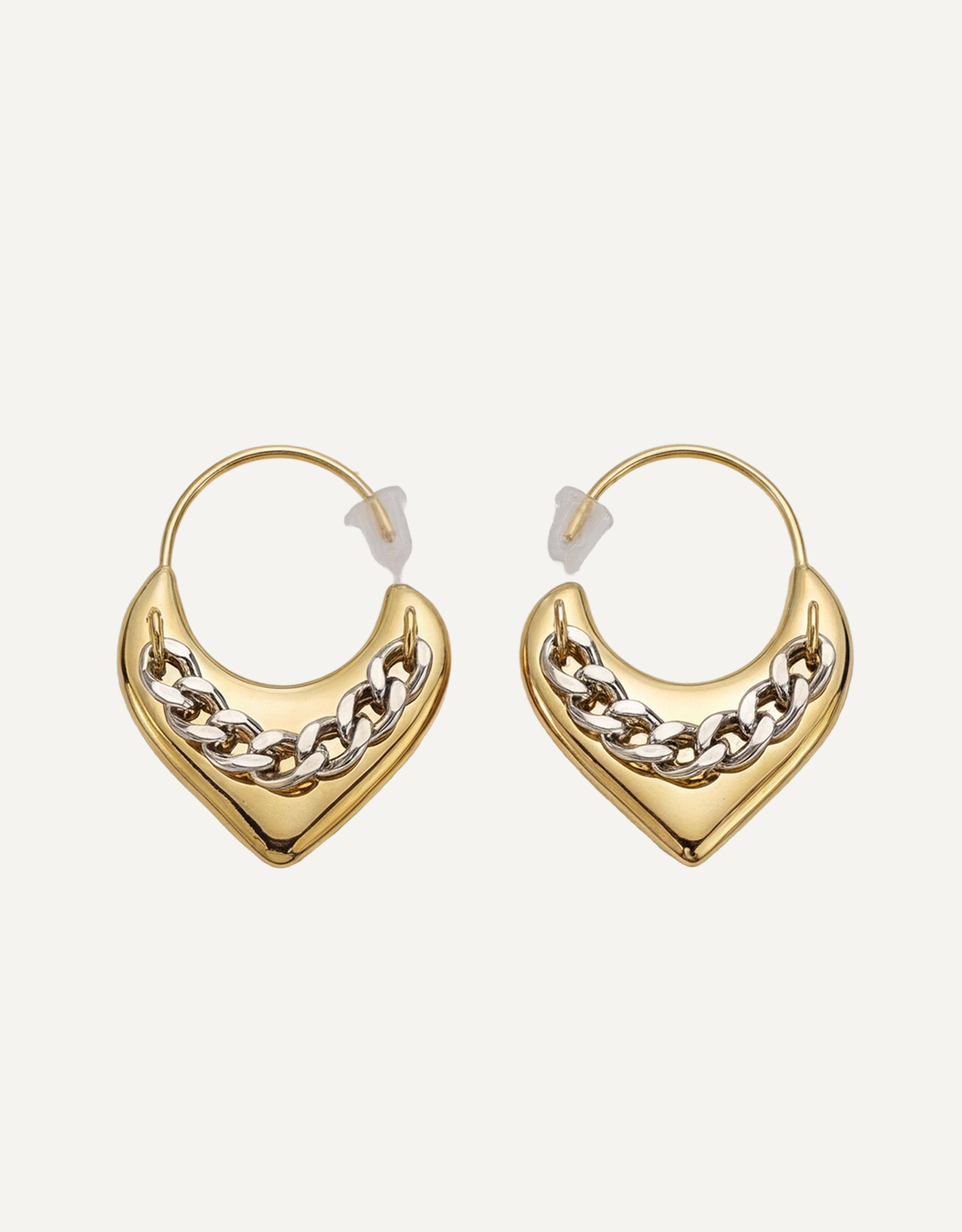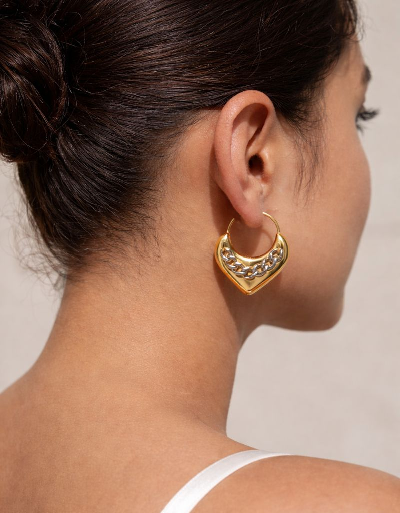 The Linked Heart Hoops reinterpret classic shapes with a bold, modern edge. Featuring a sculpted heart-inspired silhouette and a contrasting silver chain detail, these hoops bring movement, texture, and a hint of attitude to any look.