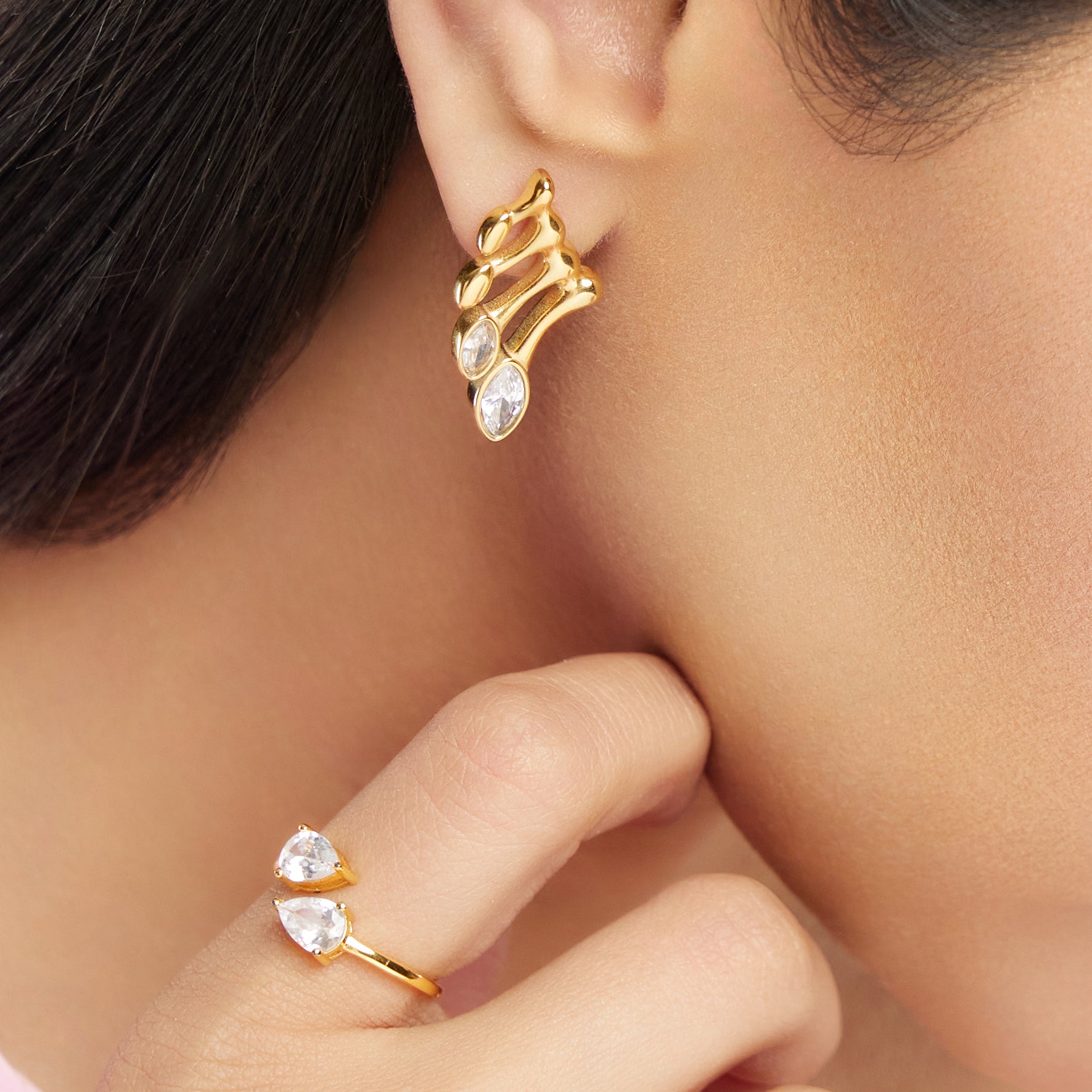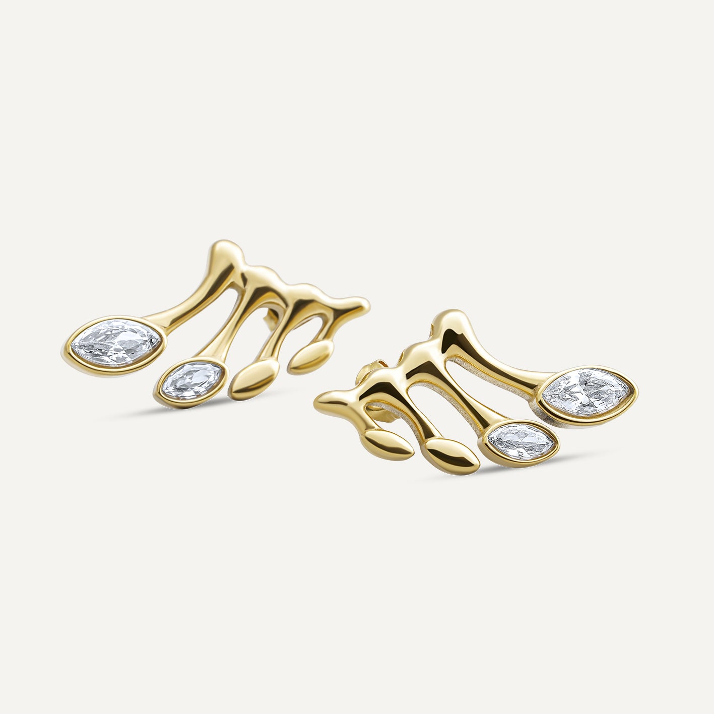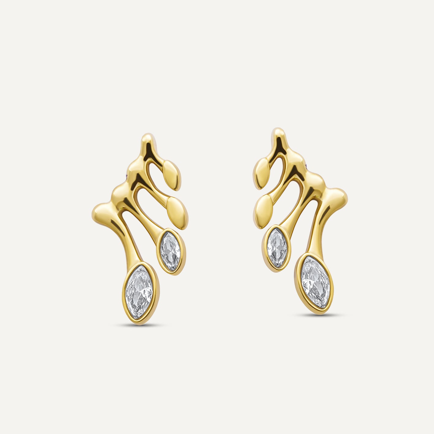 Dazzling with 18k gold plating, these earrings feature two CZ diamond stones set amidst a delicate leaf design, adding a touch of elegance suitable for any occasion.