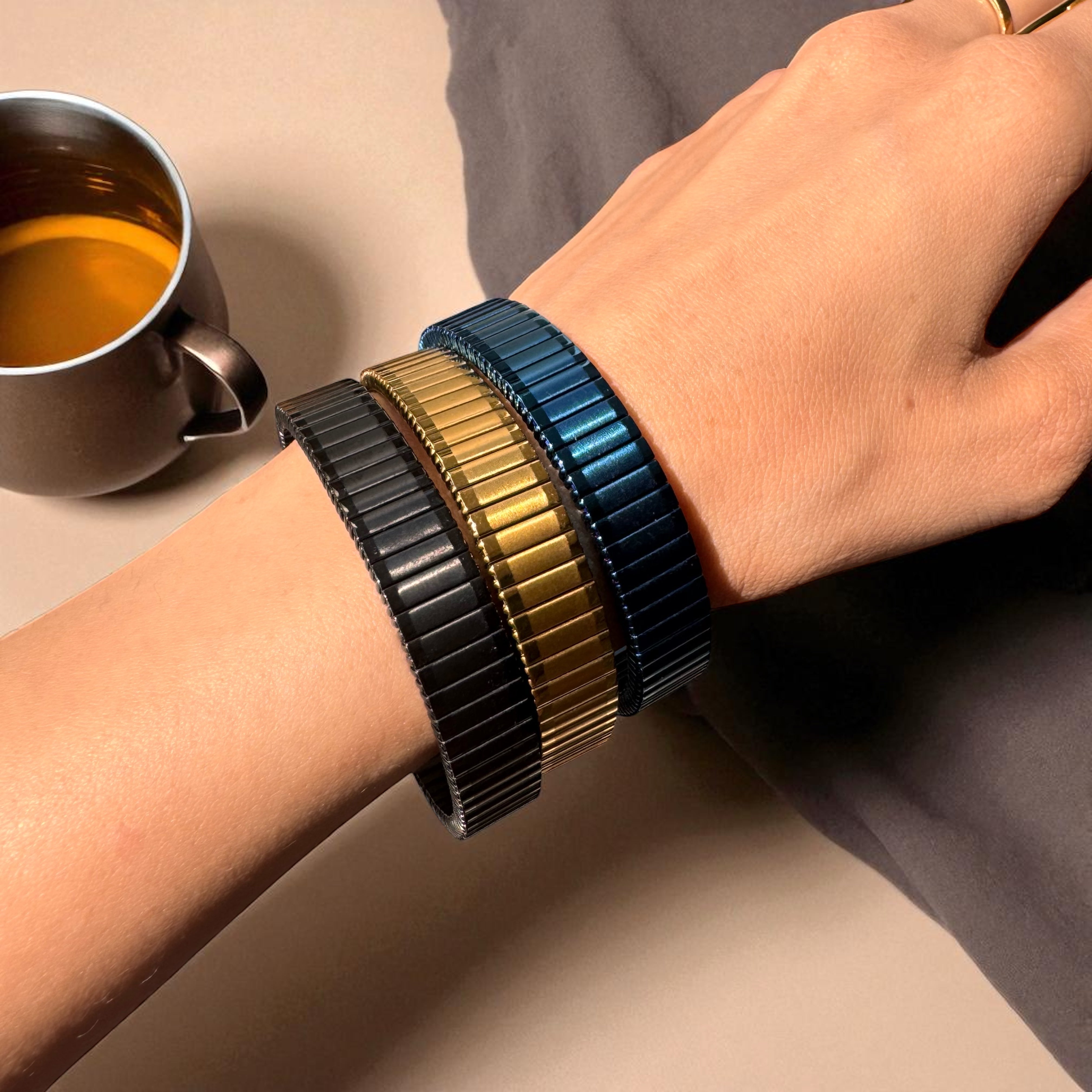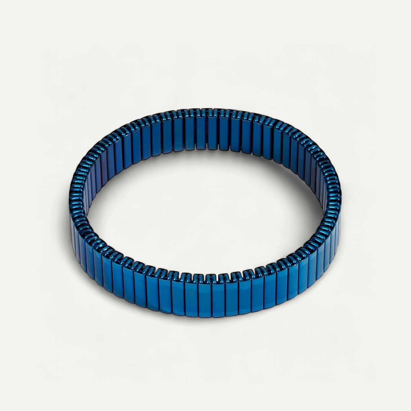 Inspired by twilight skies, the Midnight Flex Bracelet features a deep blue, stretchable band that curves gently around your wrist. A striking yet wearable piece for all occasions.