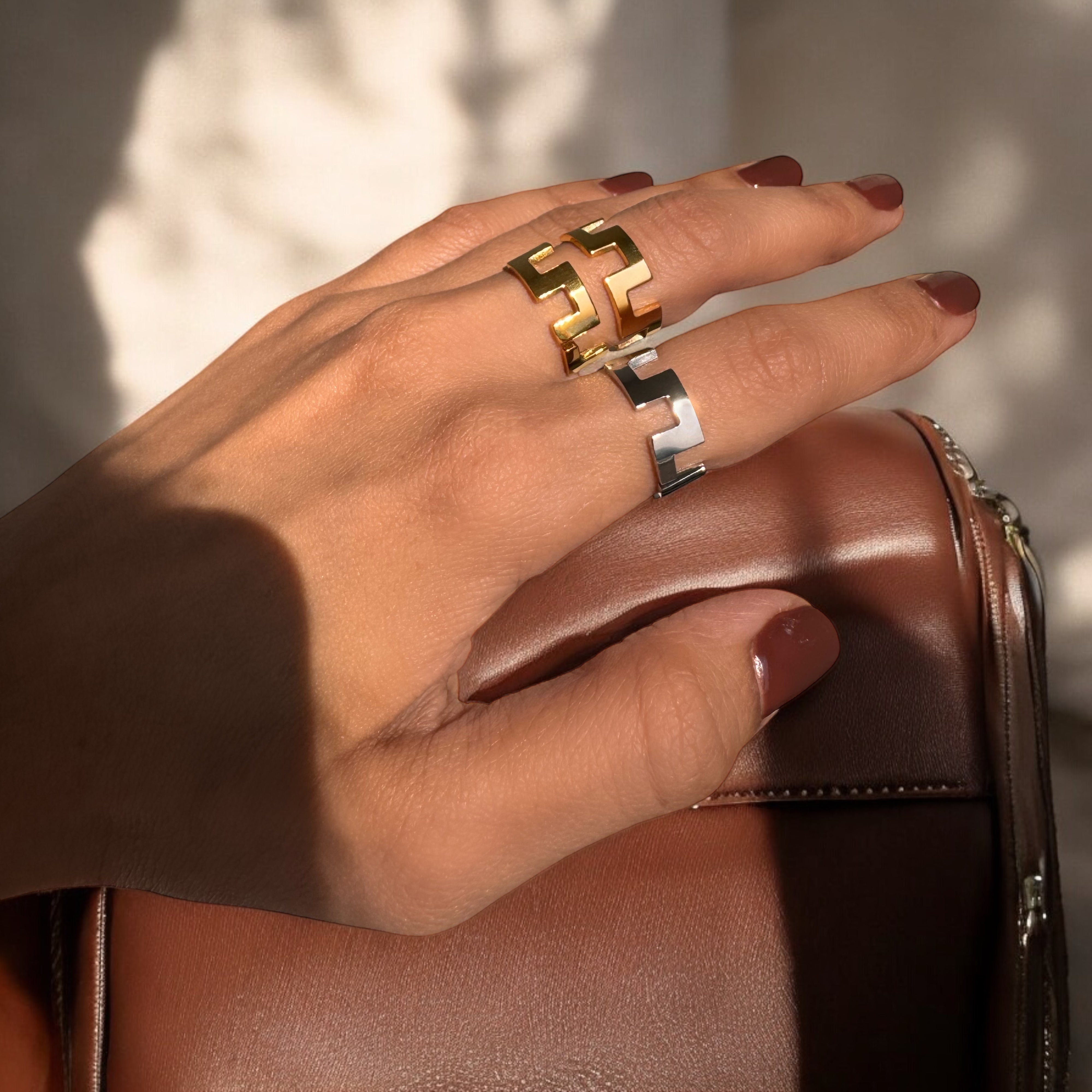The Millenia Gold Ring is the perfect match to the popular Millenia Bangle Bracelet. Made from durable medical-grade stainless steel and finished with thick 18K PVD gold plating, this ring offers a sleek, sophisticated look. Whether worn alone or paired with the bracelet, it’s a timeless piece of style and durability.