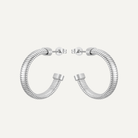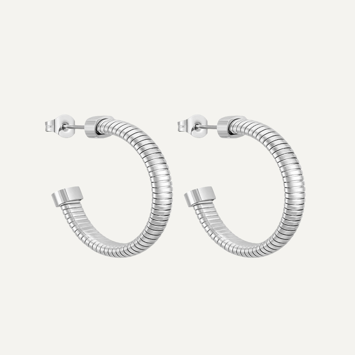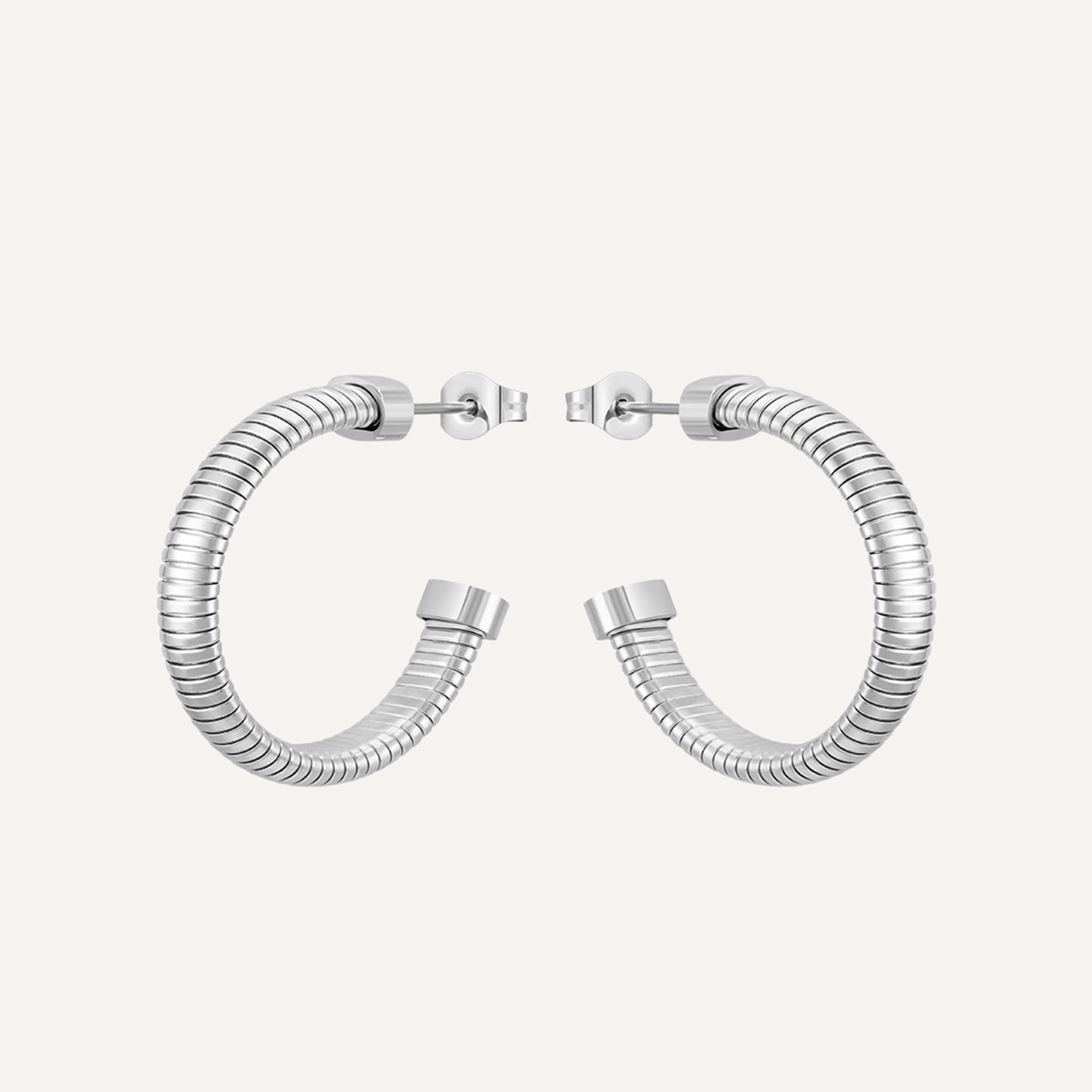 These classic hoops are lightweight and designed to perfectly match our Moonlight bracelet and choker, creating a complete set in an elegant, rich silver shade.