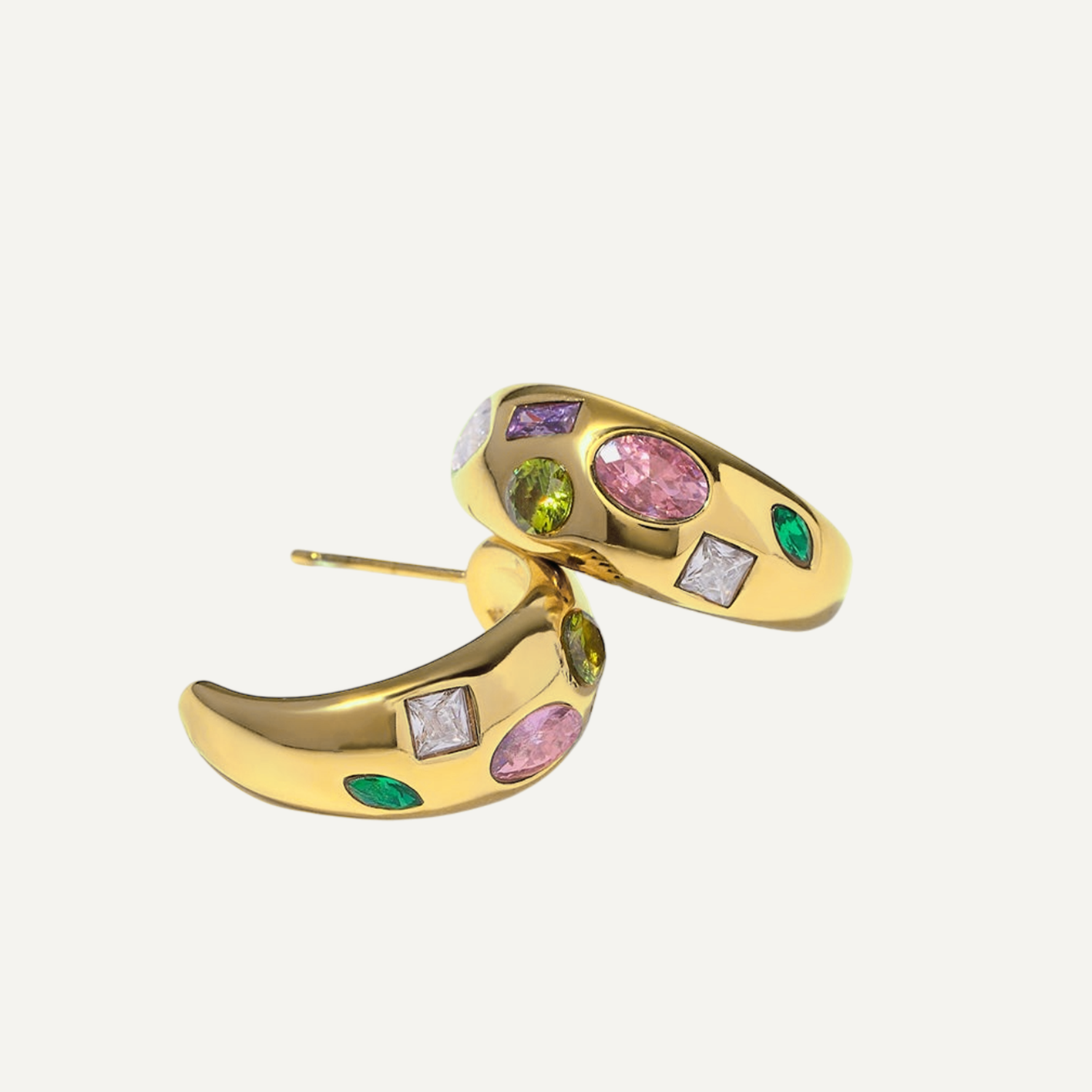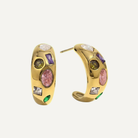 Embrace the enchanting allure of the Mystic Dome Earrings. Inspired by the design of the matching ring, these sculptural earrings feature a softly curved dome shape, adorned with vibrant, colorful zircon stones that shimmer with every movement.