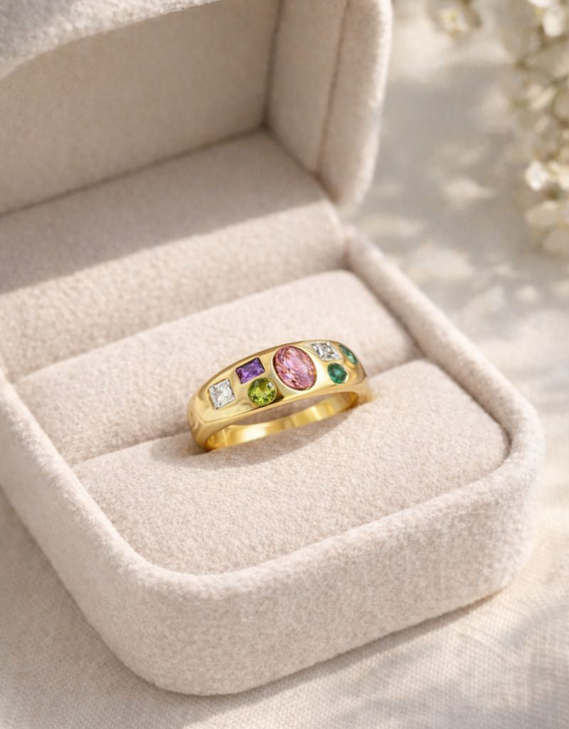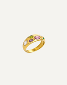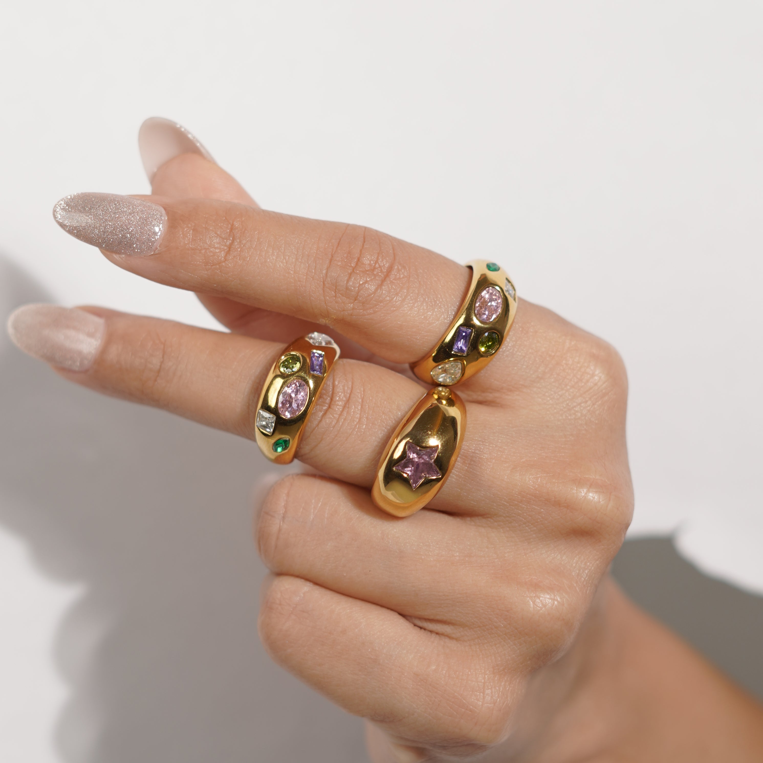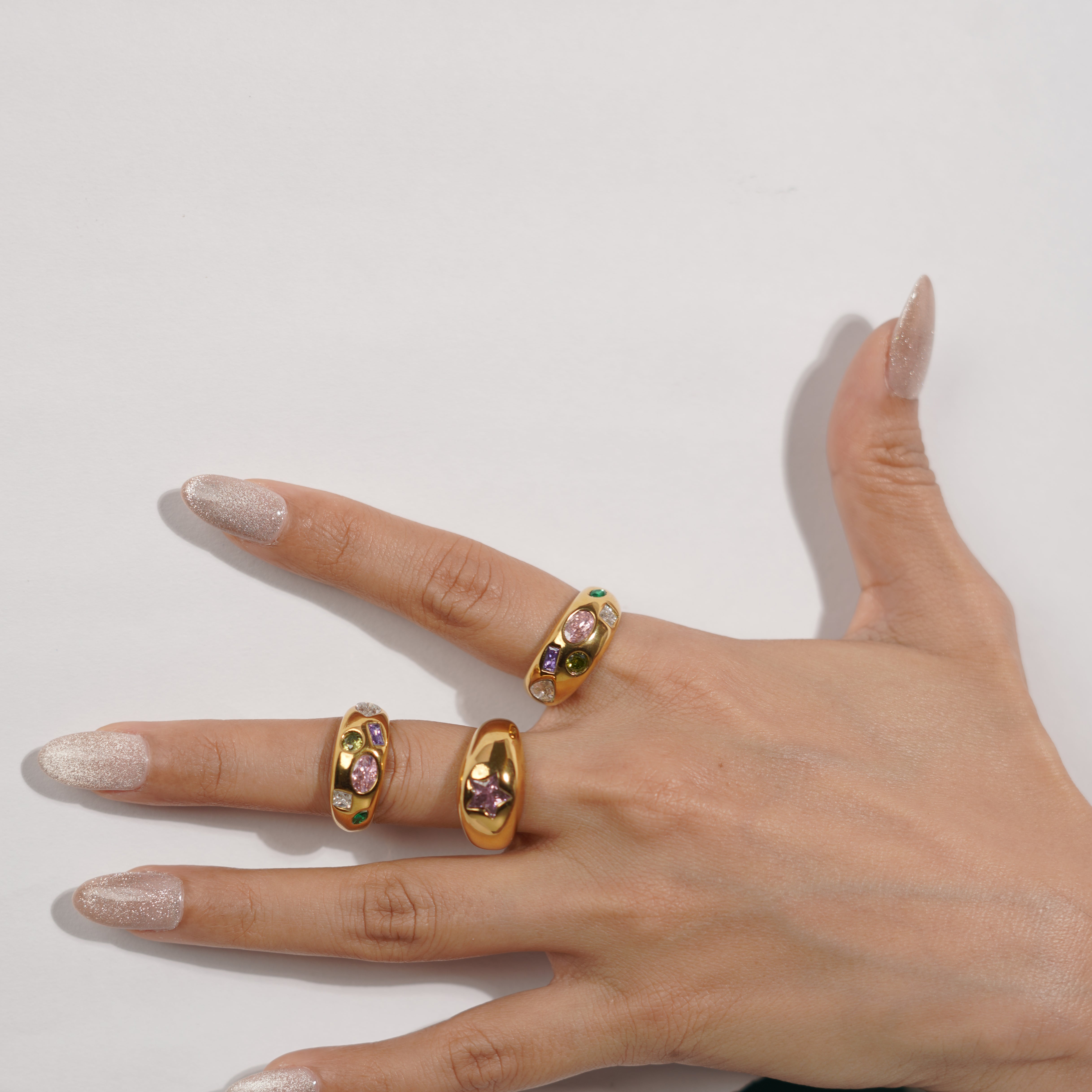 Embrace the enchanting allure of the Mystic Dome Ring. Crafted with precision, this stunning piece features a dome design adorned with vibrant, colorful zircon stones that capture the light with every movement. The brilliance of these stones reflects a spectrum of hues, creating a mesmerizing visual display reminiscent of a starlit sky.