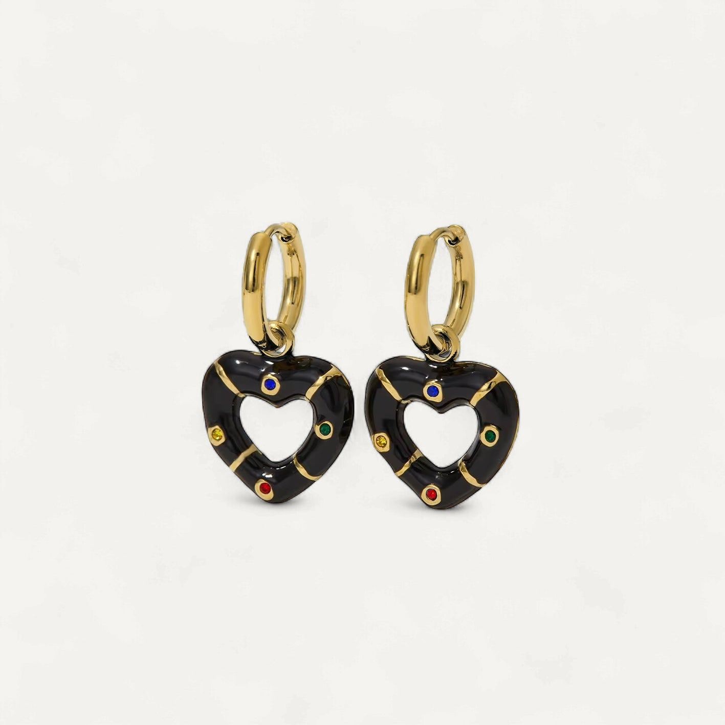 A striking combination of elegance and edge, the Noir Heart Drop Earrings feature sleek heart-shaped drops with a deep black enamel base. Adorned with vibrant, multi-colored 4A zircon stones, these earrings add a playful touch of color to your sophisticated look. Lightweight, yet bold, they’re perfect for elevating any outfit with a touch of dark luxury.