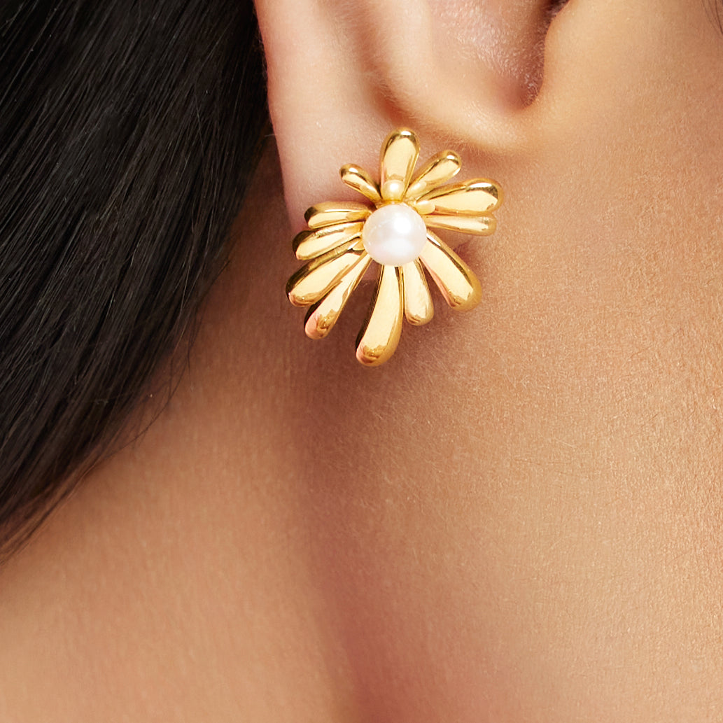 Meet the Pearl Bloom Studs, where timeless beauty meets this nature-inspired design. A lustrous pearl takes center stage, framed by radiant 18k gold petals that add a touch of elegance. The perfect blend of sophistication and charm, these earrings are versatile enough for daily wear or a special event, bringing a subtle yet luxurious sparkle to any ensemble.