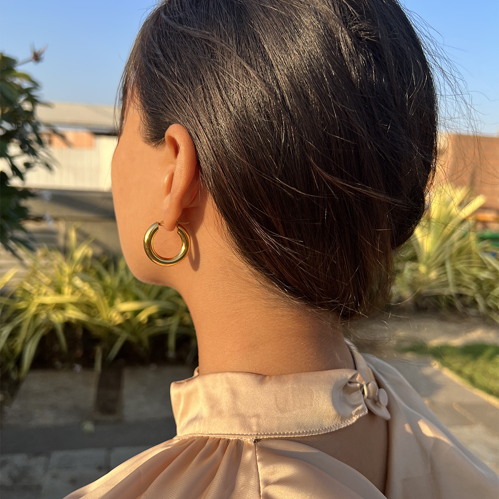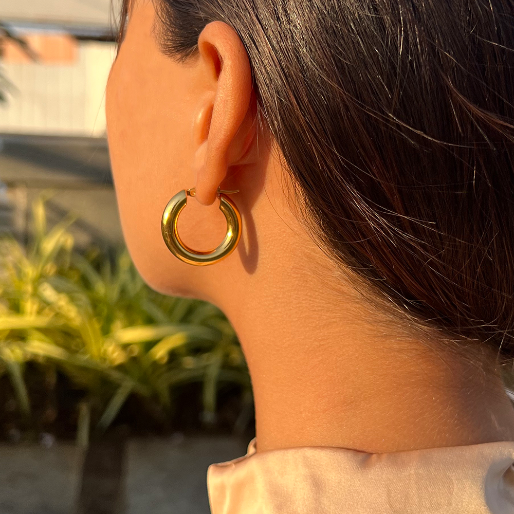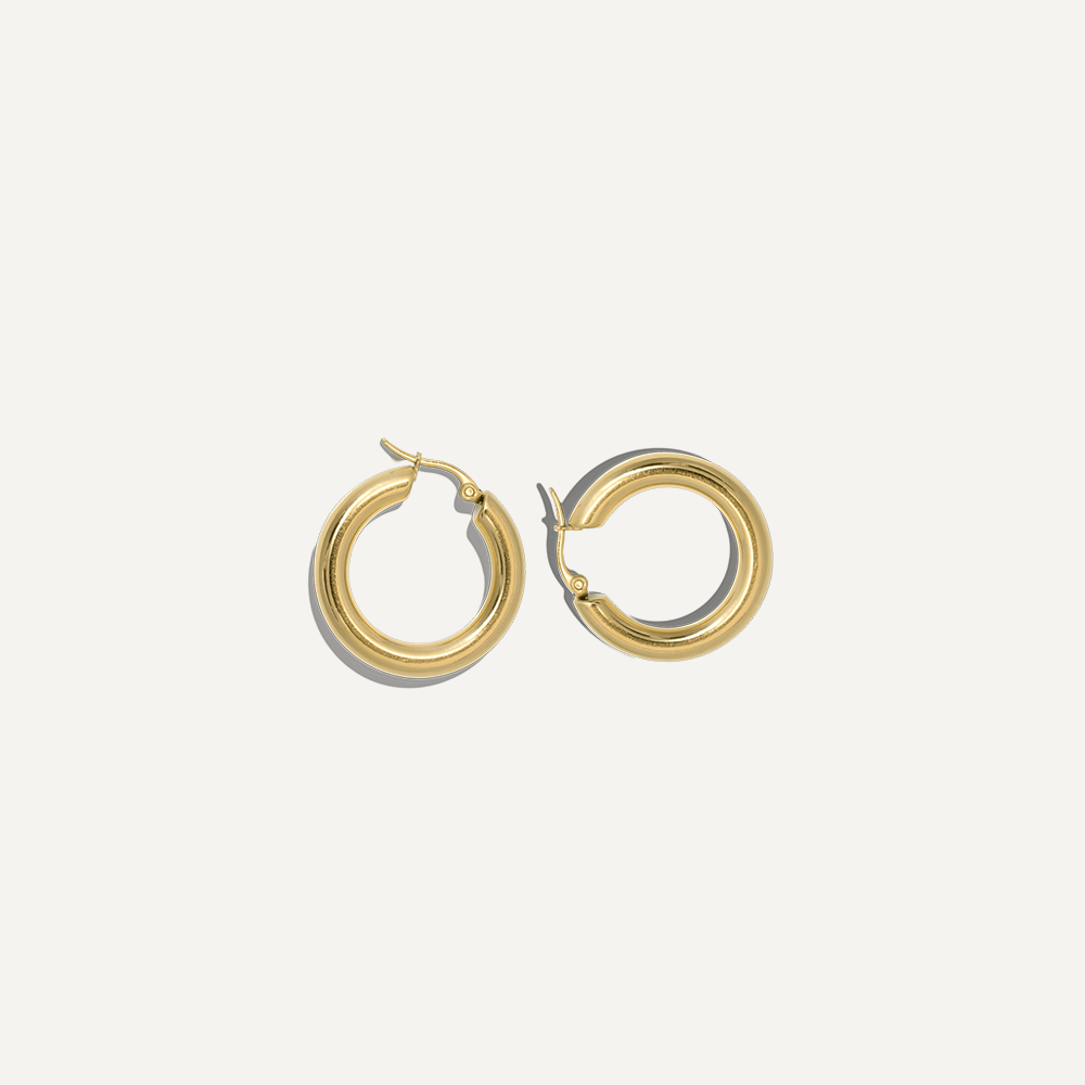 A smaller version of our 5pm Classic Hoops, these can be worn every day, all day long. Thick 18k PVD Gold Plating on Stainless Steel.