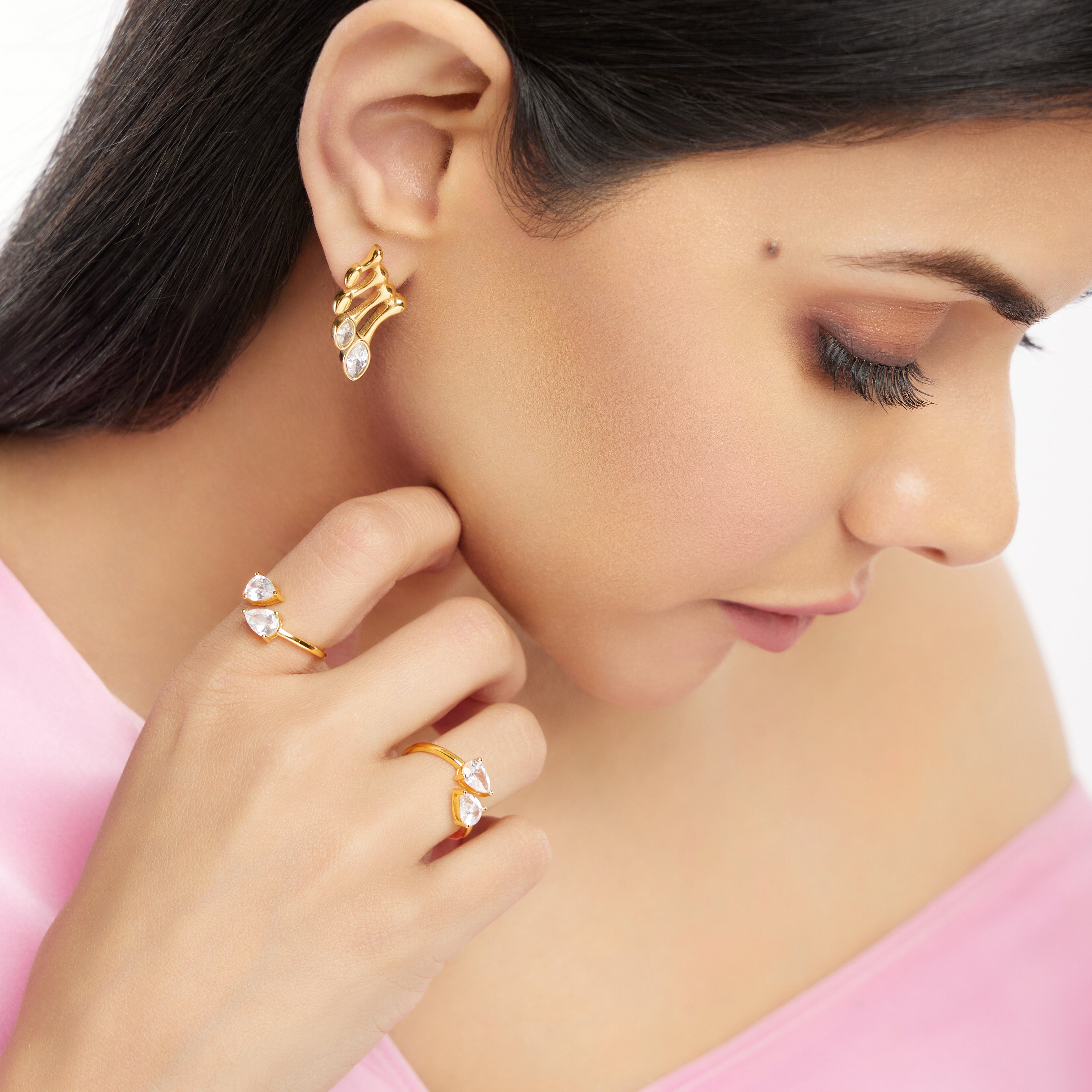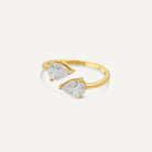 This open-ended ring design is a dream come true. Crafted in 925 silver with thick 18k Gold Plating, a very impactful design with a teardrop Diamond stone on each size that can be adjusted to fit your ring size.