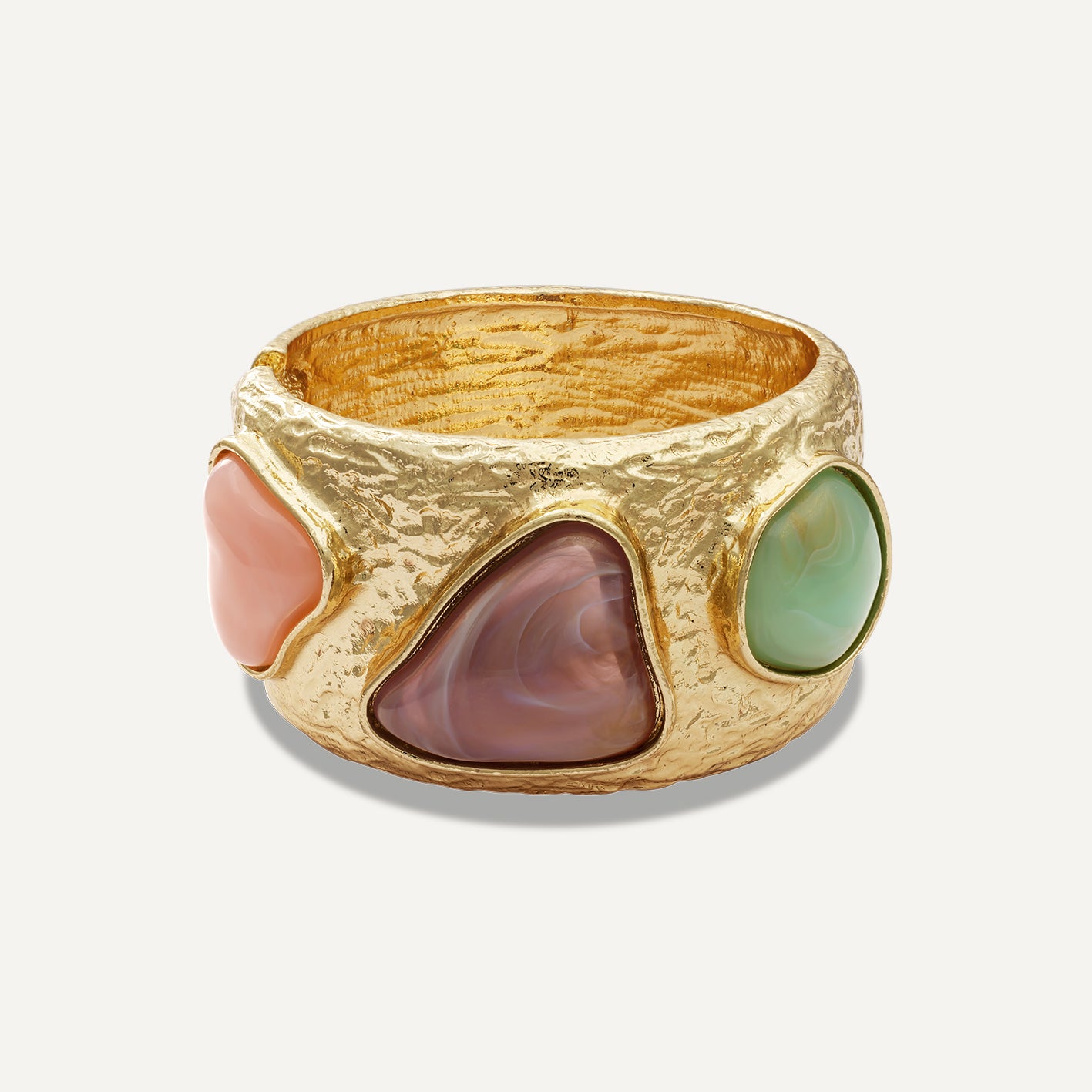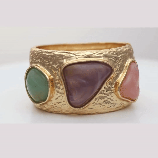 The perfect accessory for anyone who wants to add a touch of elegance & style to their look. Made with synthetic gemstones in difference shades of pink tourmaline, chrysoprase, and purple jasper. A gold tone frame holding the 3 stones with a thick band to make a statement.